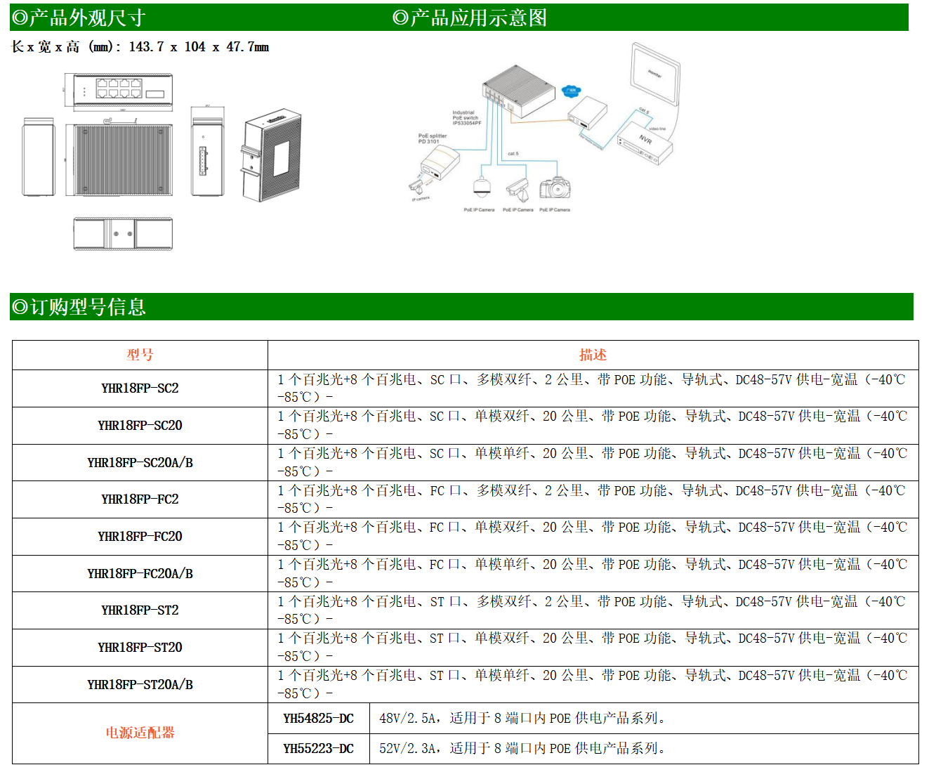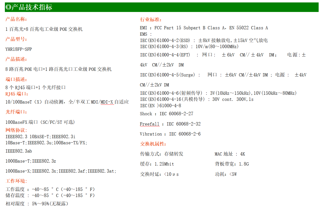 8路百兆POE電口+1路百兆FX光口工業(yè)級以太網(wǎng)POE交換機,支持8個10/100Base-TX電口和1個100Base-X光口。產(chǎn)品符合FCC、CE、ROHS標(biāo)準(zhǔn)。YH200-18FP交換機具有-40℃~85℃的工作溫度,具有超強的堅固度能適應(yīng)各種嚴(yán)苛環(huán)境,也可以非常方便的安置在空間緊湊的控制箱中。導(dǎo)軌的安裝特性、寬溫操作及擁有IP40防護(hù)等級的外殼及LED指示燈,使YH200-18FP成為一個即插即用的工業(yè)級設(shè)備,為用戶的以太網(wǎng)設(shè)備聯(lián)網(wǎng)提供可靠、便捷的解決方案。