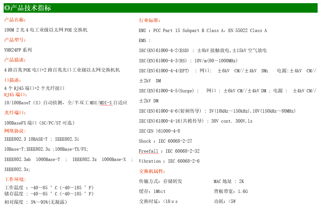 4路百兆POE電口+2路百兆FX光口工業(yè)級以太網(wǎng)交換機,支持4個10Base-T/100Base-TX電口和2個100Base-X光口。產(chǎn)品符合FCC、CE、ROHS標準。YH200-24FP系列交換機具有-40℃~85℃的工作溫度,具有超強的堅固度能適應各種嚴苛環(huán)境,也可以非常方便的安置在空間緊湊的控制箱中。導軌的安裝特性、寬溫操作及擁有IP40防護等級的外殼及LED指示燈,使YH200-24FP成為一個即插即用的工業(yè)級設備,為用戶的以太網(wǎng)設備聯(lián)網(wǎng)提供可靠、便捷的解決方案。