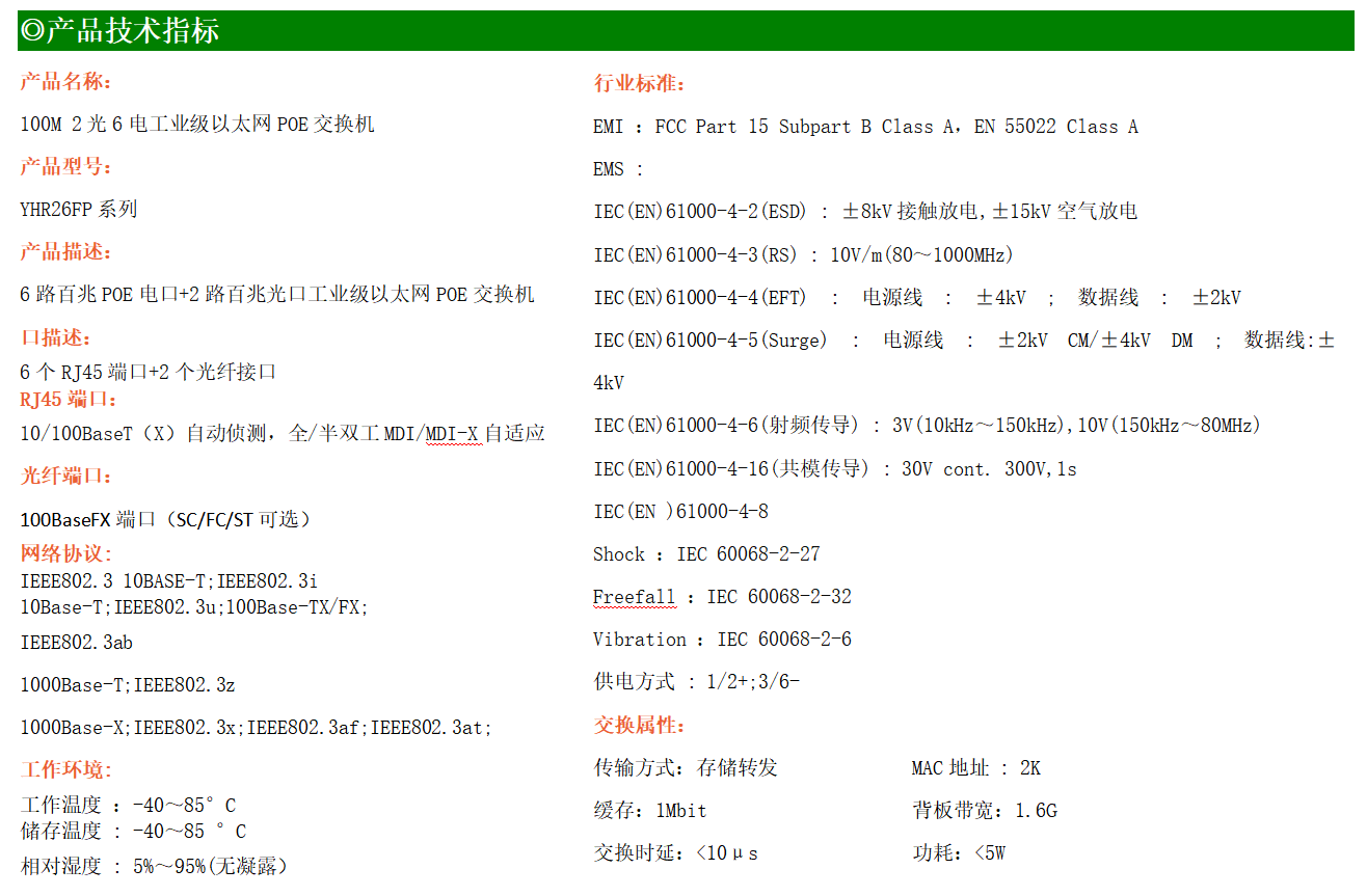 6路百兆POE電口+2路百兆FX光口工業級以太網交換機,支持6個10Base-T/100Base-TX電口和2個100Base-X光口。產品符合FCC、CE、ROHS標準。YH200-26FP系列交換機具有-40℃~85℃的工作溫度,具有超強的堅固度能適應各種嚴苛環境,也可以非常方便的安置在空間緊湊的控制箱中。導軌的安裝特性、寬溫操作及擁有IP40防護等級的外殼及LED指示燈,使YH200-26FP成為一個即插即用的工業級設備,為用戶的以太網設備聯網提供可靠、便捷的解決方案。