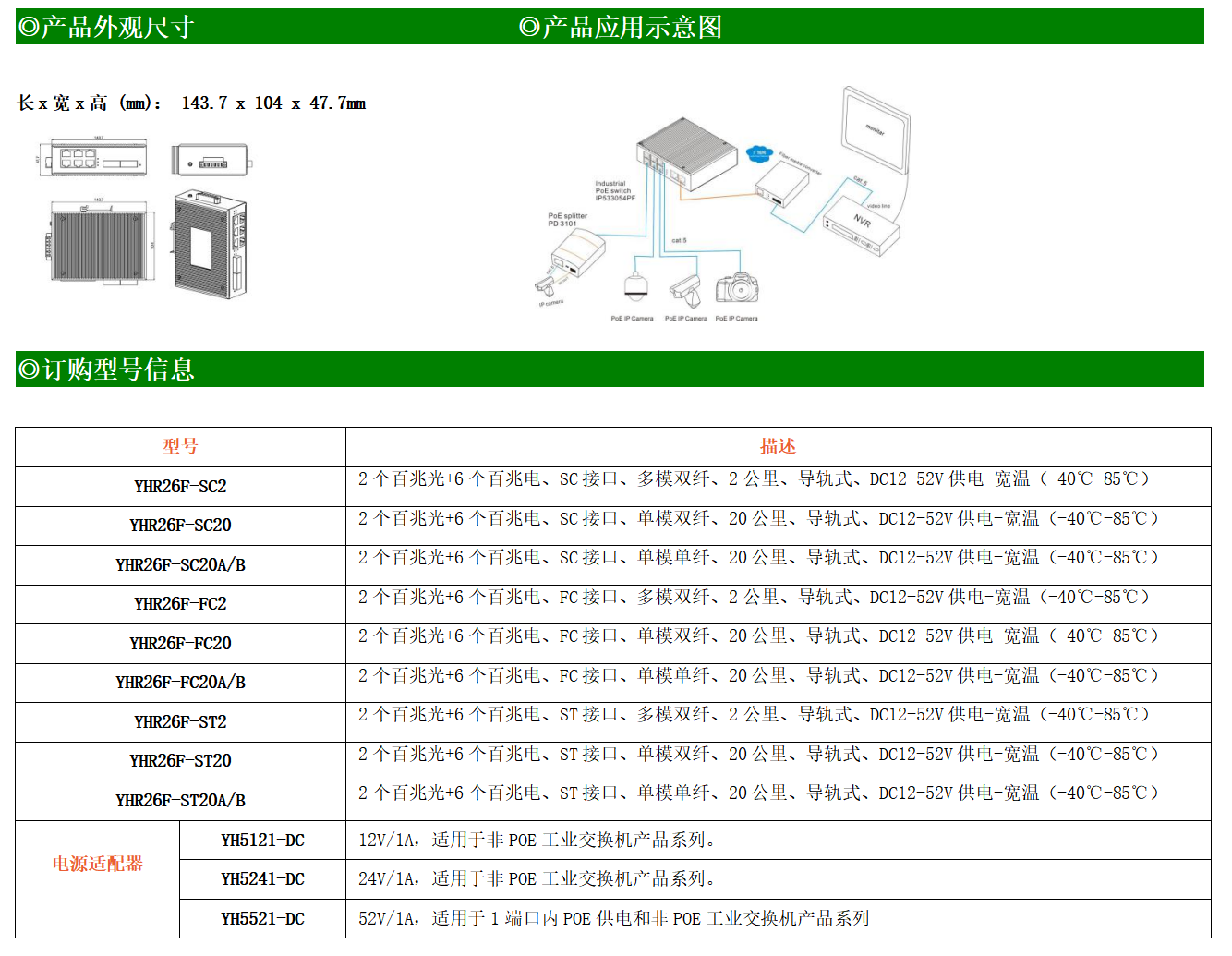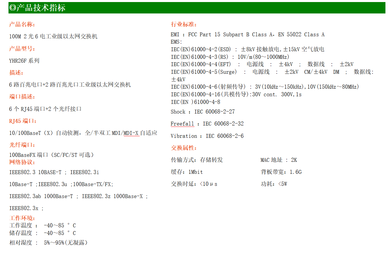 6路百兆電口+2路百兆FX光口工業(yè)級以太網(wǎng)交換機,支持6個10Base-T/100Base-TX電口和2個100Base-X光口。產(chǎn)品符合FCC、CE、ROHS標(biāo)準(zhǔn)。YH200-26F系列交換機具有-40℃~85℃的工作溫度,具有超強的堅固度能適應(yīng)各種嚴(yán)苛環(huán)境,也可以非常方便的安置在空間緊湊的控制箱中。導(dǎo)軌的安裝特性、寬溫操作及擁有IP40防護等級的外殼及LED指示燈,使YH200-26F成為一個即插即用的工業(yè)級設(shè)備,為用戶的以太網(wǎng)設(shè)備聯(lián)網(wǎng)提供可靠、便捷的解決方案。